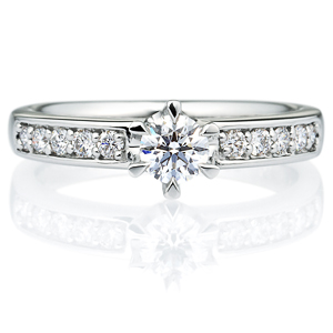 シンプルに輝きを添えたデザインにひと目で惹かれて。二人らしいサイドストーンの婚約指輪
