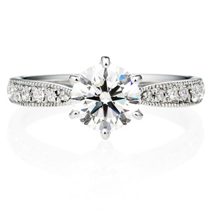 真ん中のダイヤモンドに向かって細くなっていくデザインで、周りにメレダイヤがあり理想通りでした。他のブランドでミル打ちのデザインを見た時にミルが大き過ぎて好きになれなかったので、初めはミルなしで考えていました。しかしブリリアンス+さんで提案いただいたので見てみると、ミルの方がいいかも!と思い出し、結局ミルありで購入しました。こちらではミルが小さく細かいので、ダイヤモンドの煌めきを引き立てくれてると感じました。