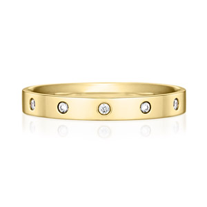 長く身に付けることを考えたらシンプルな結婚指輪に辿り着き、2.5㎜のストレートラインにダイヤが5つ入ったデザインのものを、中指か人差し指に着けられるサイズでお願いしました。
