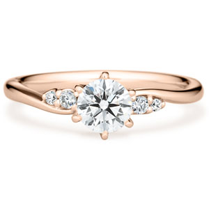 花の香りのように広がる魅力をイメージして『ロゼット』と名付けました。センターダイヤモンドを支えるように、サイドに二石ずつメレダイヤモンドをあしらった贅沢な婚約指輪。繊細でしなやかなウェーブを描いたアームは、センターに向かって絞られるようなシェイプで、柔らかく女性らしい印象です。サイドストーンを少し低い位置に留めることで、センターダイヤモンドが際立ち、品の良い華やかさを演出するよう仕上げています。