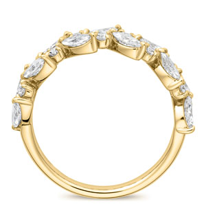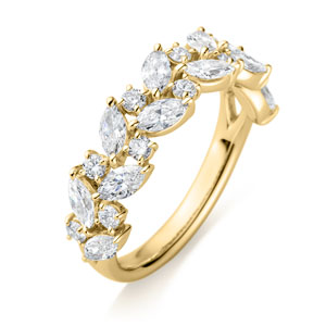 マーキスカットとラウンドカットのダイヤモンドを、永遠を象徴する月桂樹の葉をイメージしあしらったエタニティリング『レフィナ』。ラボグロウンダイヤモンドならではの端正な輝きと圧倒的な存在感、そしてリースを思わせるデザインが、指元に愛らしさと華やかさをもたらして。裏面はレース模様を思わせる造りで、見えない細部まで美しさを感じられるリングです。※こちらのリングはデザイン上リング内側刻印の文字数に制限がございます。サイズ#4〜17半角英数字で6文字