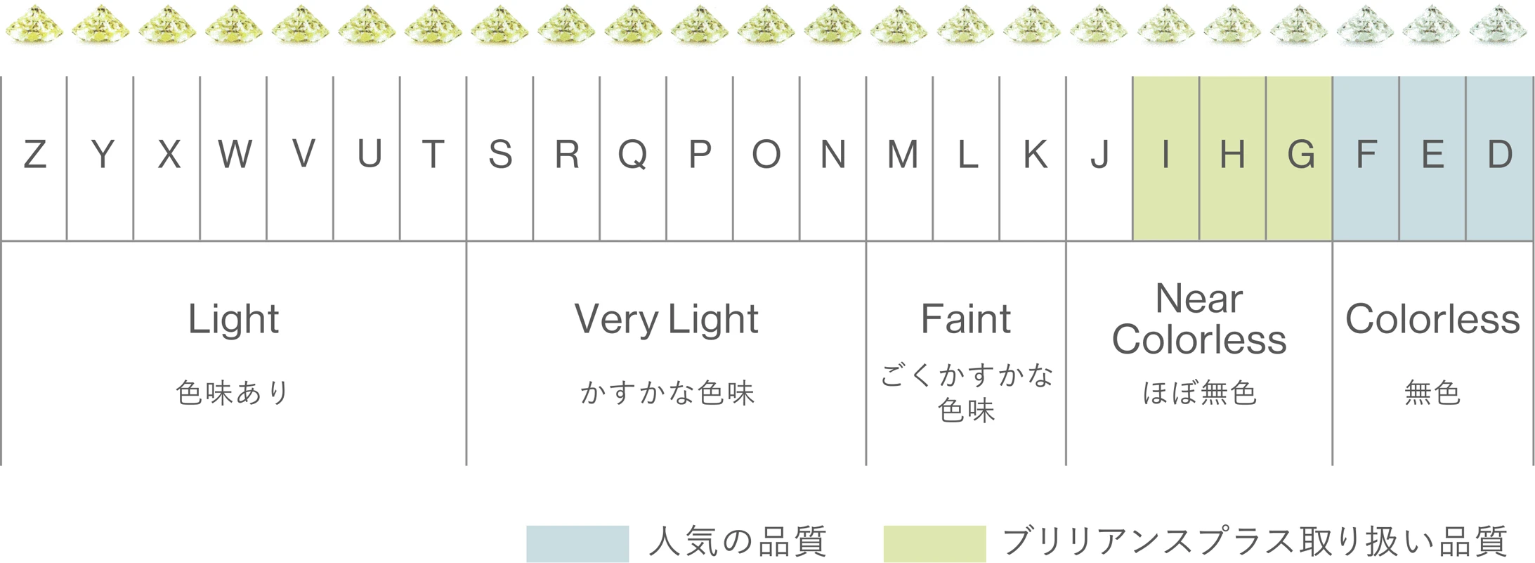 ジュエリーに使用されるダイヤモンドのほとんどは、色評価がカラーレス(無色)やニア・カラーレスのものですが、少しの色味の差が価値に大きな影響をもたらします。科学的にも純粋で不純物のない本当に無色なカラーレスダイヤモンドを最上位とし、色味が薄くなればなるほど価値が高まります。